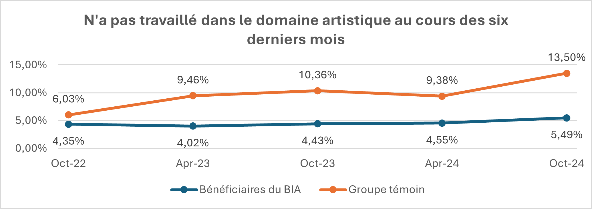 Un autre résultat significatif du projet pilote BIA est la rétention sectorielle. Dans le groupe témoin, le pourcentage d’artistes n’ayant pas travaillé dans le domaine des arts au cours des six mois précédents est passé d’environ 6 % en 2022 à plus de 13 % en 2025. Parmi les bénéficiaires du BIA, ce chiffre est resté stable, oscillant entre 4 et 5 %.
