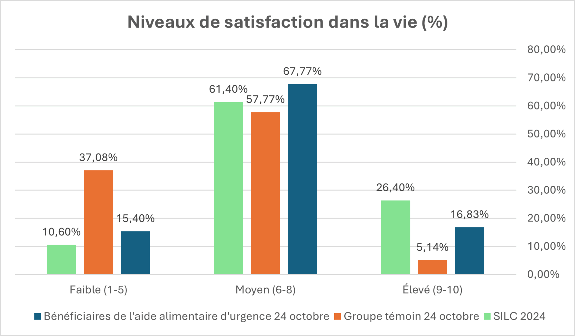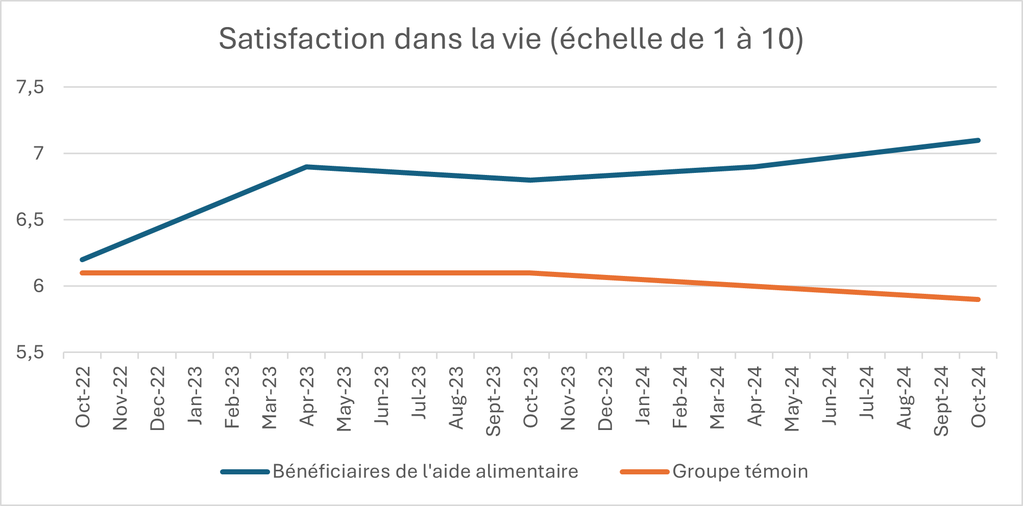- Scores de satisfaction dans la vie : les bénéficiaires obtiennent en moyenne environ 7/10, contre 6/10 pour le groupe témoin.